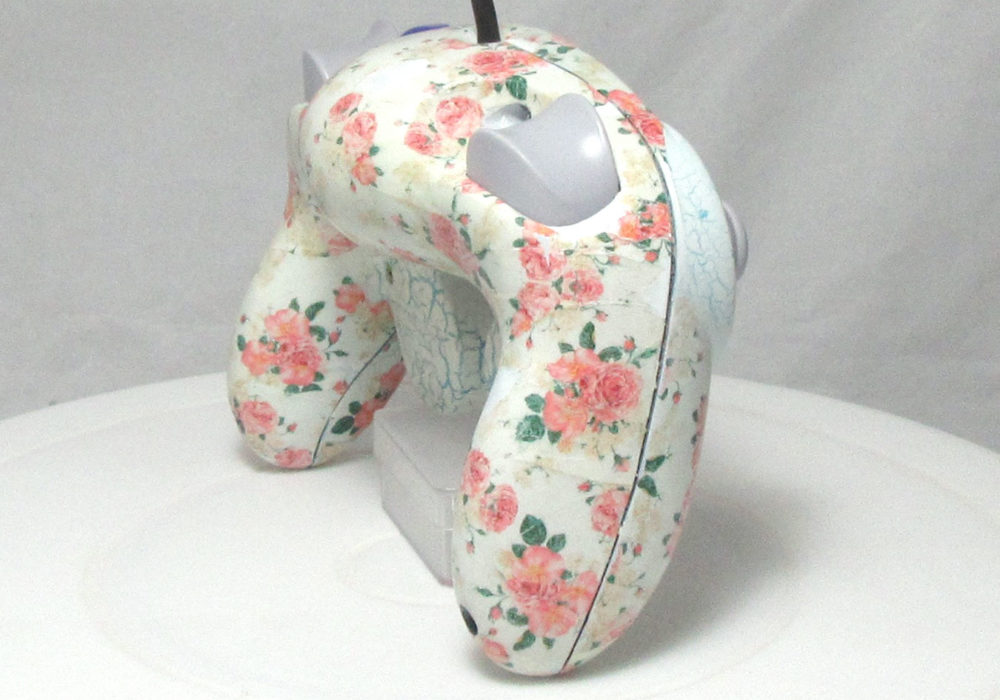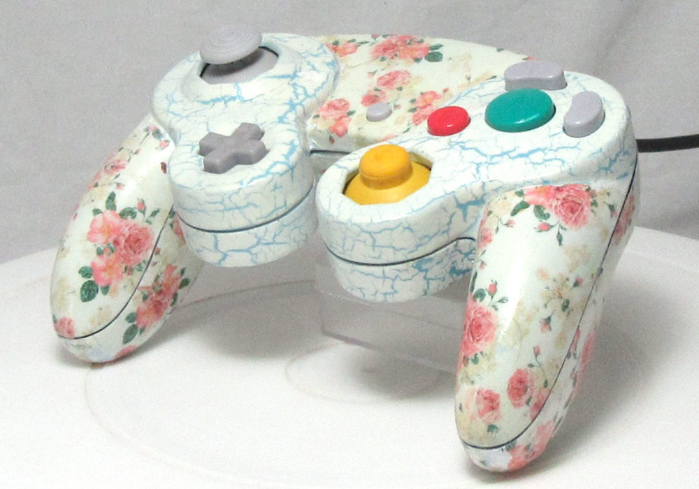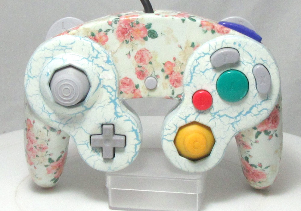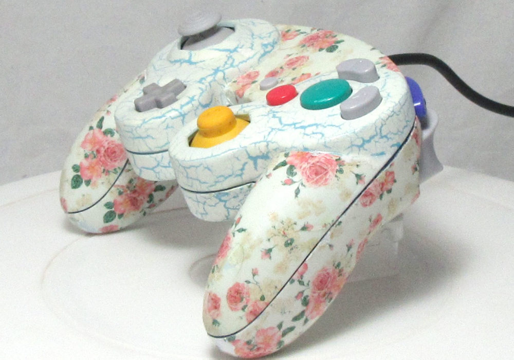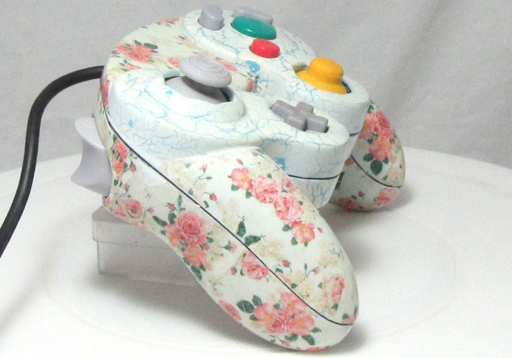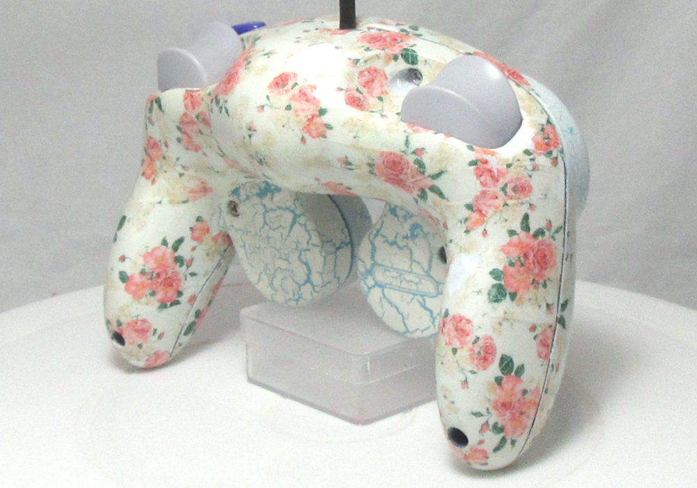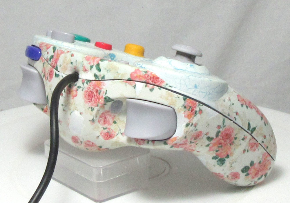 The main body of the controller is covered in a waterslide transfer of white and pink floral wallpaper. The wallpaper is cracked and ripped in places due to the nature of the application making each handmade controller unique.
